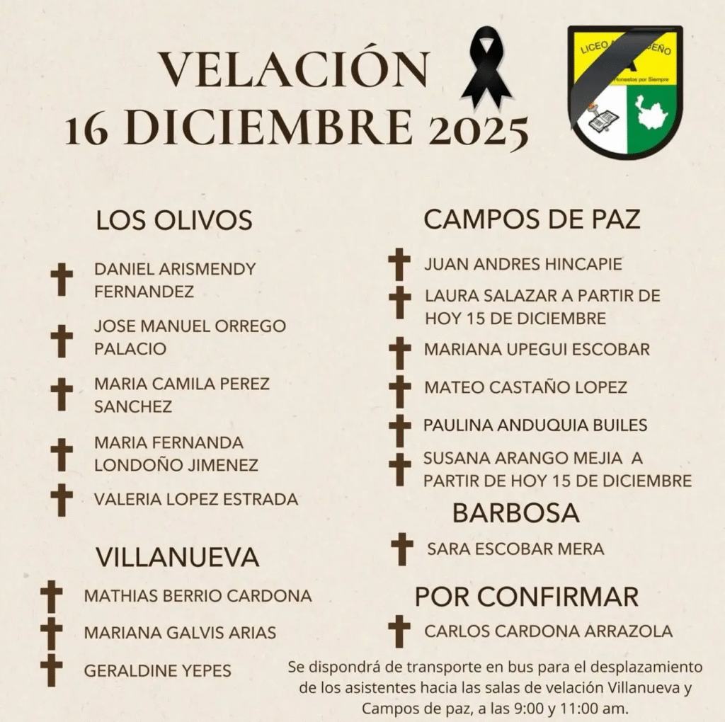 Tras la conmoción que sacudió al departamento por el siniestro vial ocurrido en la vía a Remedios, la comunidad educativa del Liceo Antioqueño y las familias de las víctimas se preparan para afrontar uno de los momentos más dolorosos: la despedida final. Para este martes 16 de diciembre de 2025 se ha establecido un cronograma de velaciones, distribuido en distintos camposantos del Valle de Aburrá y municipios cercanos, con el fin de organizar el acompañamiento masivo de la ciudadanía.