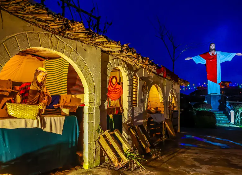 Concebido como el pesebre más grande de Antioquia, el montaje no se limita a una escena central ni a una vista panorámica: es un recorrido inmersivo que se despliega a lo largo de senderos, jardines y construcciones a escala real, que cobra más sentido cuando cae la noche.